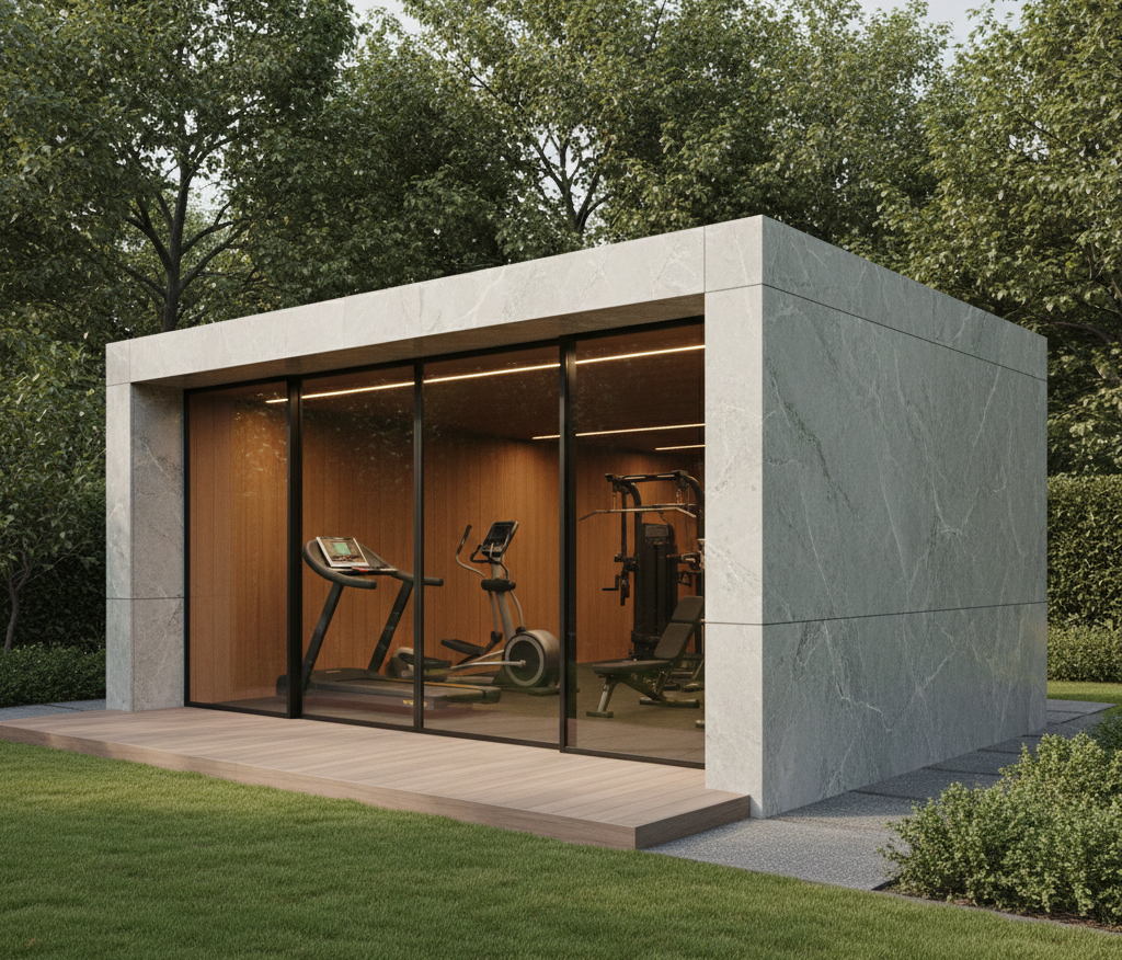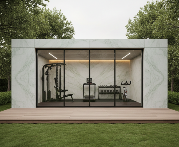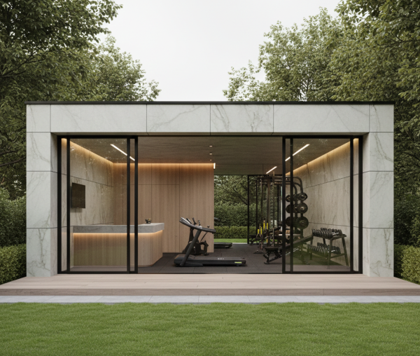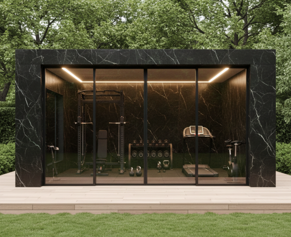 The Garden Gym features a clean, rectangular architectural form with perfect proportions and premium material finishes.